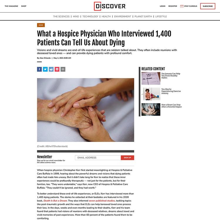 Messaging focused on raising awareness of Dr. Kerr’s book Death Is But a Dream, a captivating telling of first-hand research conducted with HPCB patients about their experience with dreams and visions throughout the dying process. Our work strengthened relationships with journalists by demonstrating the uniqueness and importance of this research, positioning HPCB as a modern thought leader in end-of-life care.