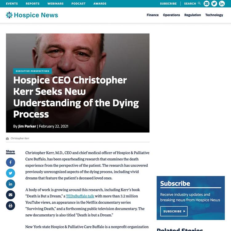 Messaging focused on raising awareness of Dr. Kerr’s book Death Is But a Dream, a captivating telling of first-hand research conducted with HPCB patients about their experience with dreams and visions throughout the dying process. Our work strengthened relationships with journalists by demonstrating the uniqueness and importance of this research, positioning HPCB as a modern thought leader in end-of-life care.