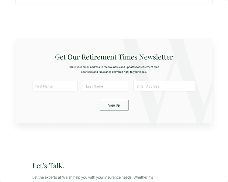 From the small — but impactful — strategic changes, like revising the URL from Walshins.com to WalshDuffield.com, to the subtle, custom interactions woven throughout the site, reaching the complex SEO considerations made on both the front- and back-end, our process was purposely all-encompassing. We truly believe that each small detail and pixel plays an integral role in the quality of the big picture. It’s with this attention to detail that each choice along the way helped to equally contribute to the ultimate success.